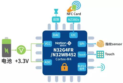 ❶单片集成了“主控+安全+触控+指纹算法+DAC语音+蓝牙BLE 5.0(N32WB452系列)”功能