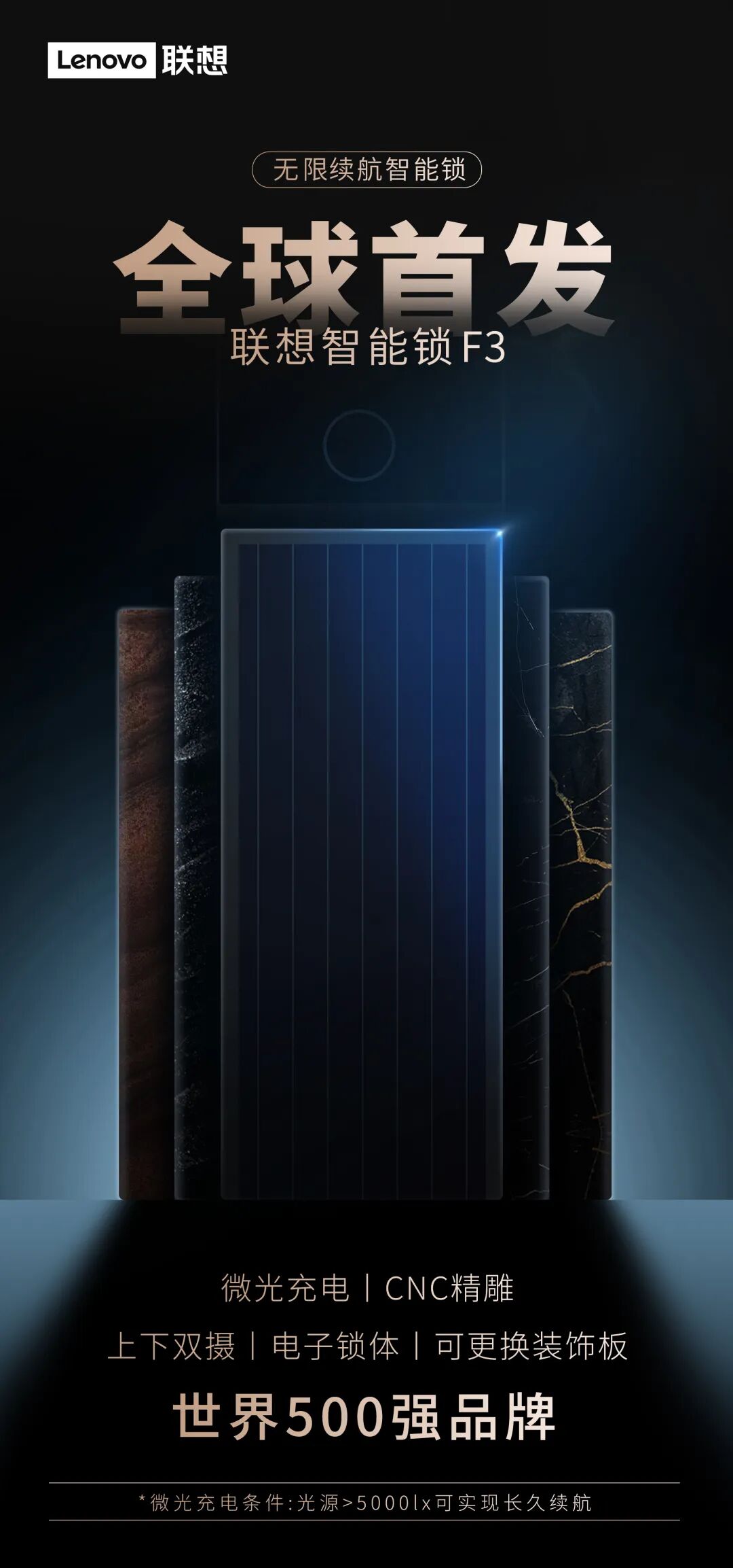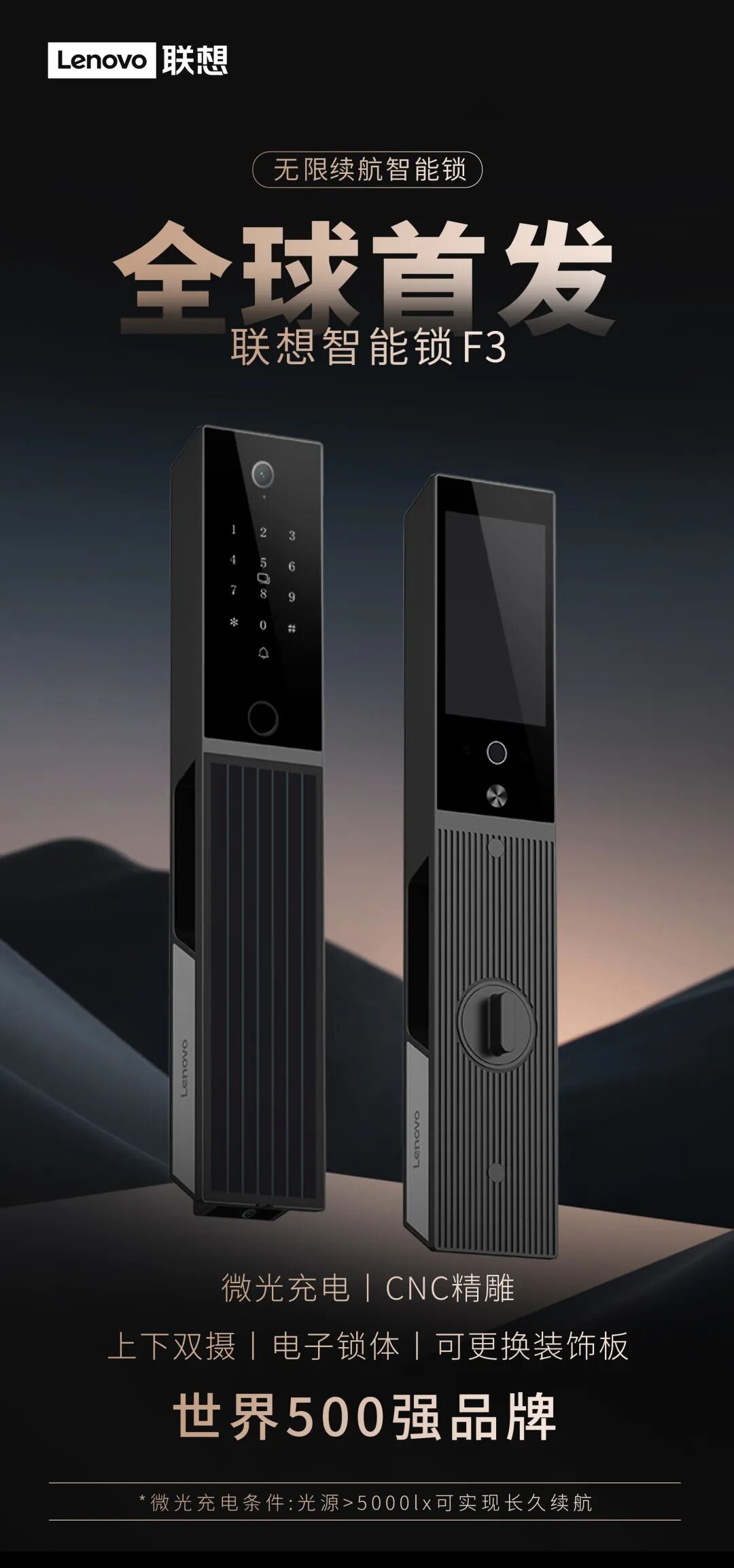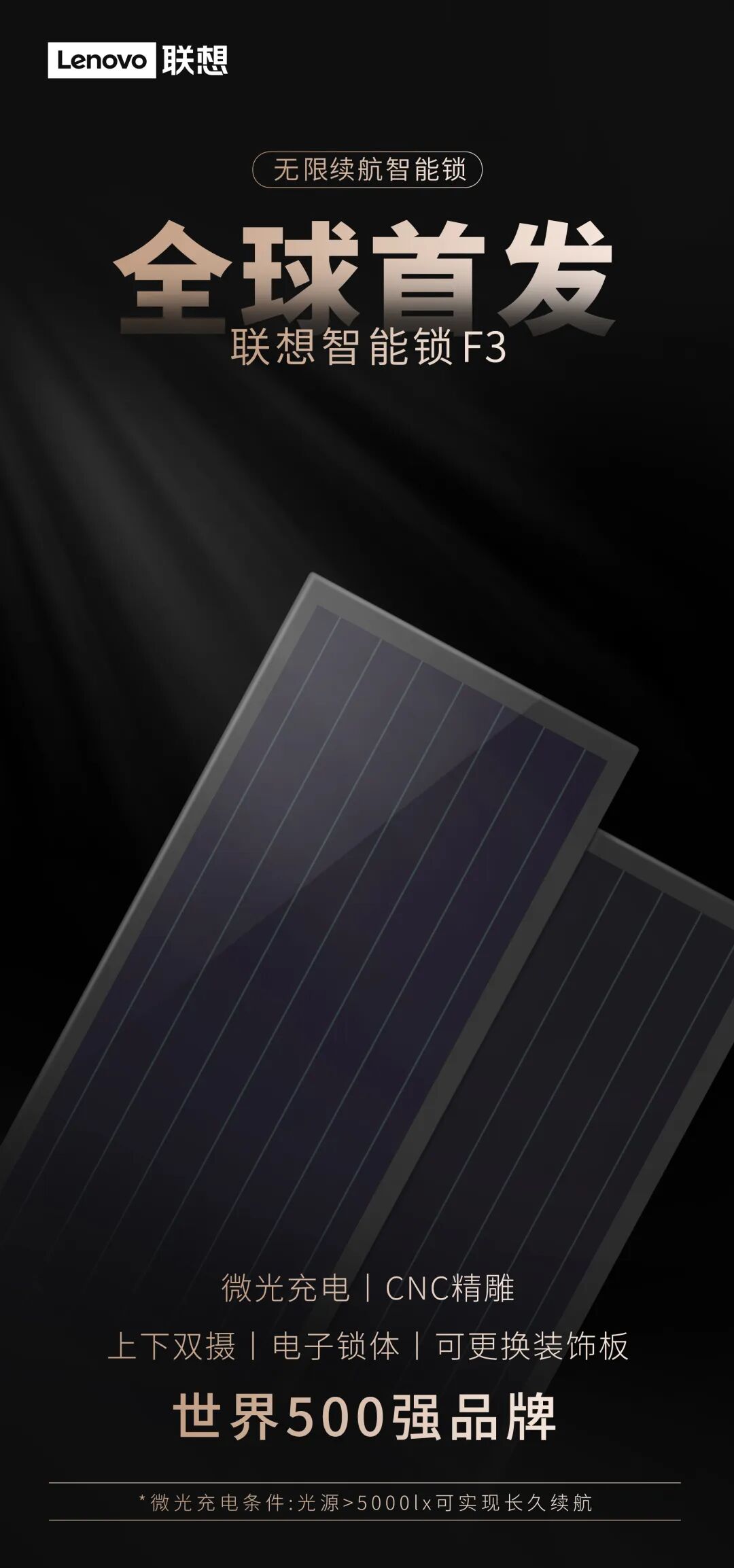 联想,世界500强品牌,已经研发出全球首款采用钙钛矿太阳能技术的智能锁,在一定条件下可以实现无限续航。