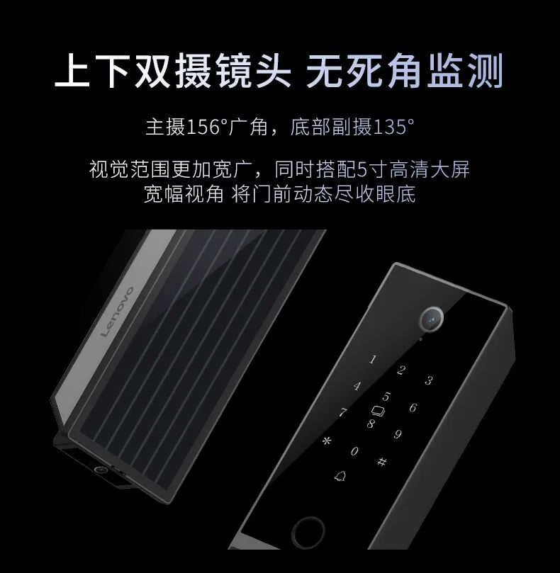 联想智能锁F3前置高清双摄镜头,主摄156°广角,底部副摄135°摄入面,视觉范围更加宽广,无死角监测门前动态。