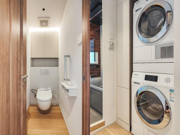 主卧:洗脸台与化妆台相连,护肤动线缩短一半;三七折门后是独立马桶间,管道厚度做成薄柜收纳清洁用品;6cm宽墙体内嵌叠放洗衣机+烘干机,上方还有收纳格;浴室采用深色水泥灰瓷砖,搭配浴缸,高级感拉满;