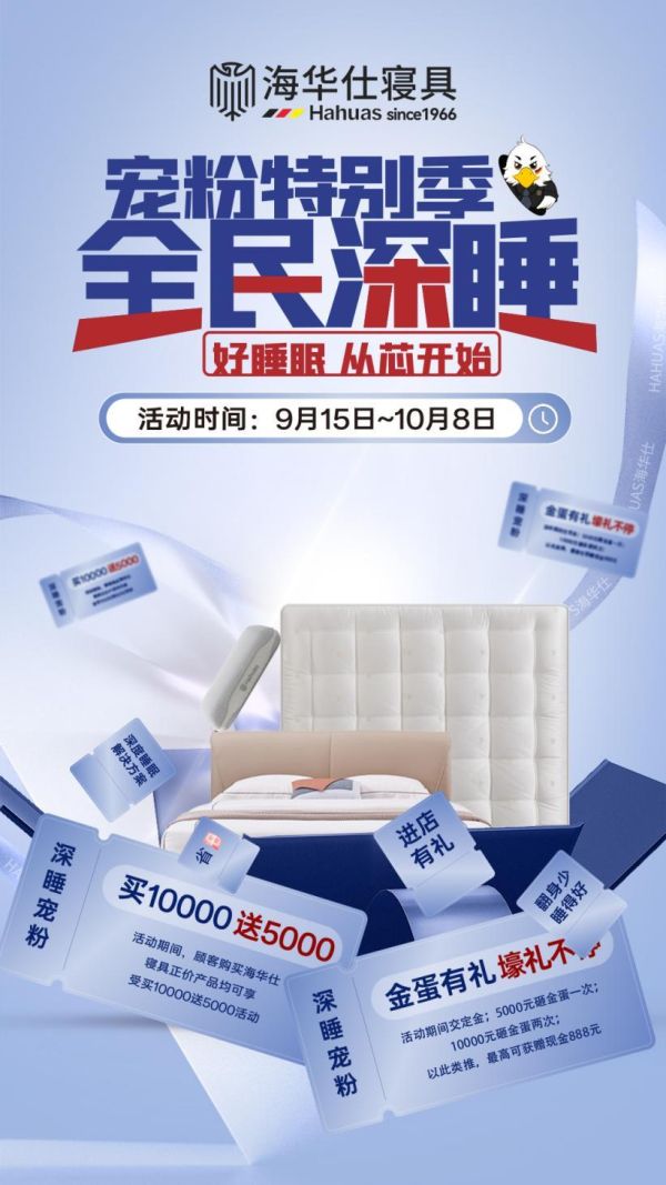 一场跨越时空的宠粉盛宴,诚邀您莅临从中国佛山顺德的匠心生产线,再到您身边的每一家海华仕门店,我们传递的不仅是产品,更是一套完整的睡眠解决方案。此刻,这场以“宠粉”为名的睡眠盛宴已准备就绪。2025年9月15日至10月8日,海华仕全国门店,我们以德系精工之纯粹,敬您每一夜的深睡安眠。期待与您相遇,共同见证海华仕如何为睡眠赋能。