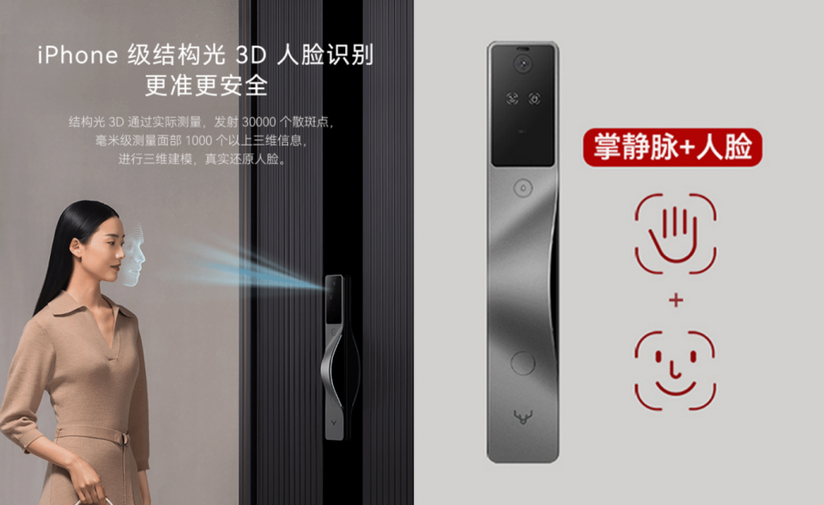 ▲鹿客门锁产品V5(使用三合一识别模组Lite P1)2023年,安思疆科技发布了极致创新的第三代3D结构光技术Lite X, Lite S等一系列产品,涵盖刷掌刷脸二合一,单刷脸,单刷掌等功能,服务包含小米、德施曼、凯迪仕、鹿客等行业头部品牌在内的数十家客户,成为业界标杆,广受好评。