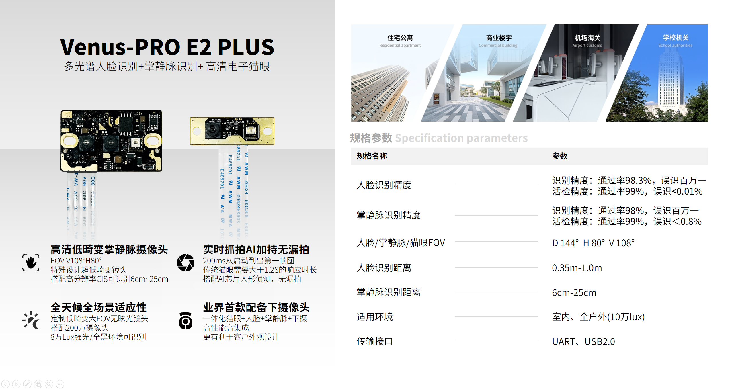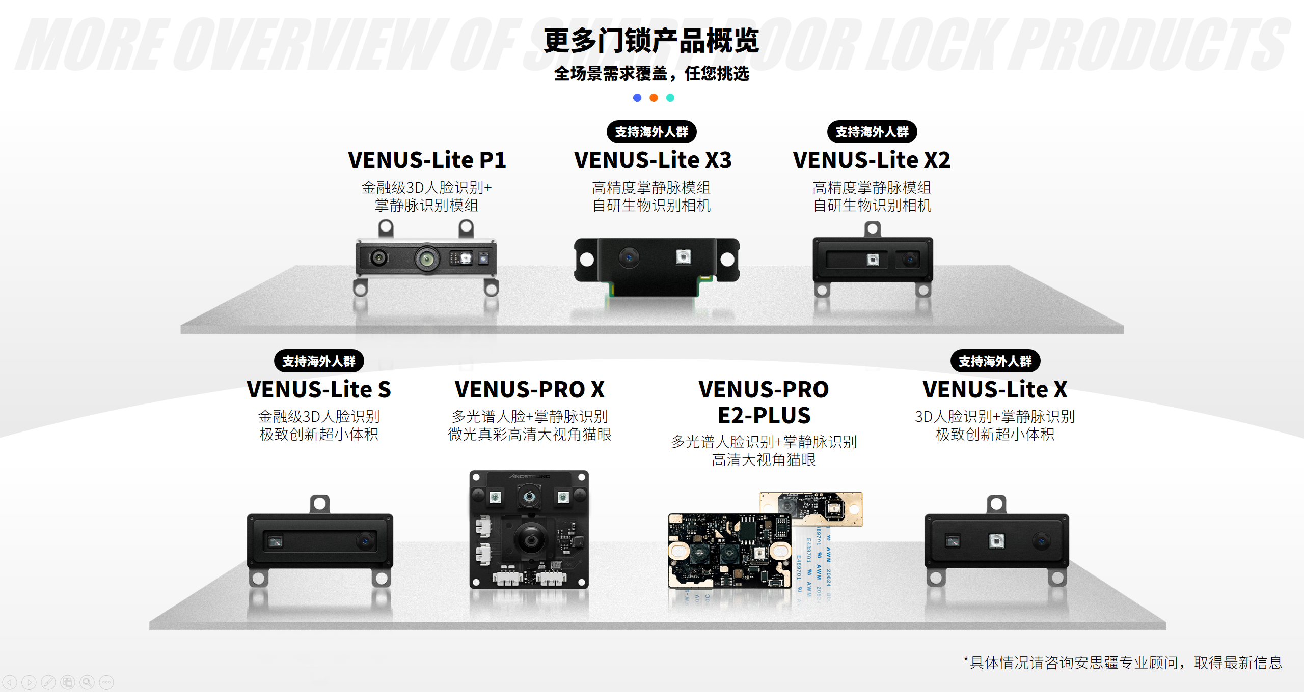 ▲安思疆Venus-PRO X三合一识别模组2025年7月份发布Venus-Pro E2,Venus-Pro E2-Plus智能门锁模组,再次突破创新极限,不仅集成人脸识别+掌静脉识别双重生物验证,更独创「双猫眼视觉系统」------- 一颗向前看护,一颗向下守护,为行业首创。