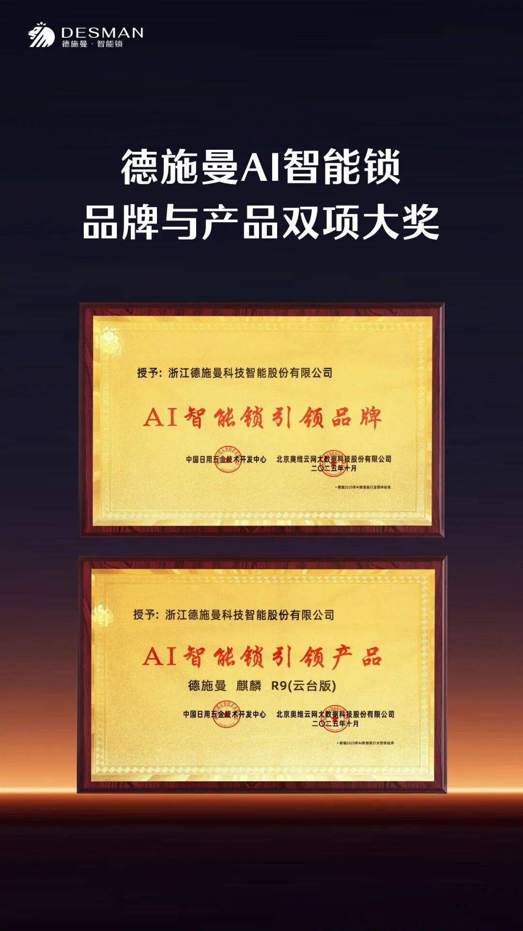 会上,德施曼荣获“AI智能锁引领品牌”称号,德施曼麒麟R9(云台版)荣获“AI智能锁引领产品奖”;