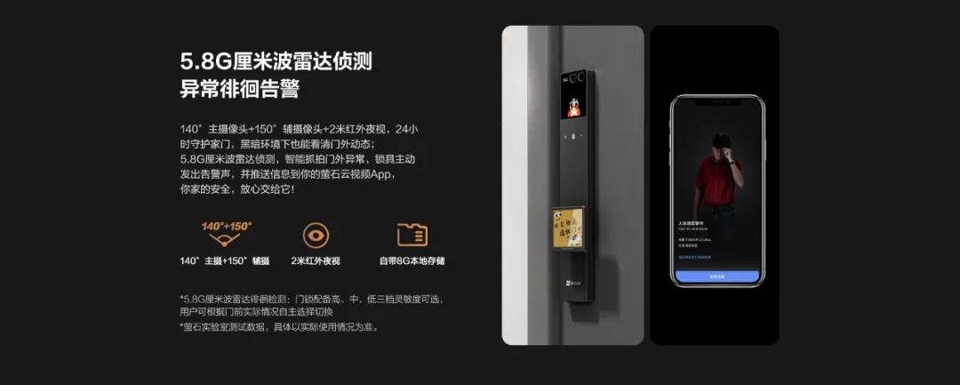 在安全防护层面,萤石启明 Y5000FVX Ultra同样实力拉满。其搭载上摄400万像素+下摄 200 万像素的双摄像头组合,双画面一体式成像,无论是门前来访人员,还是门边放置的快递包裹,都能自上而下清晰捕捉,不留视觉盲区。同时,内置的5.8G 厘米波雷达侦测系统,具备主动安防能力:当检测到门外有人异常徘徊、逗留时,门锁会立即发出高分贝告警声震慑可疑人员,并同步推送告警信息至用户的萤石云视频 App,确保用户实时掌握家门口的安全动态。