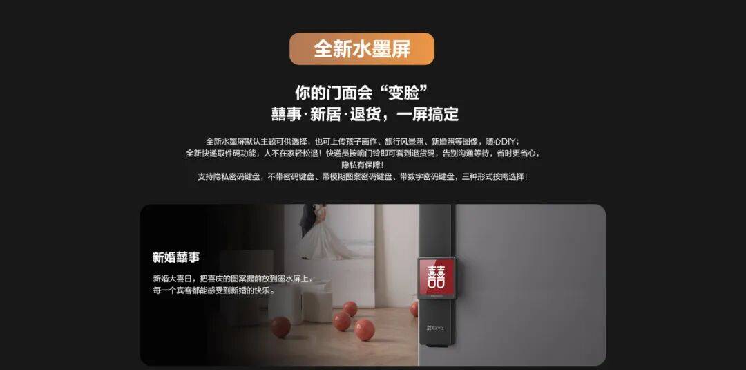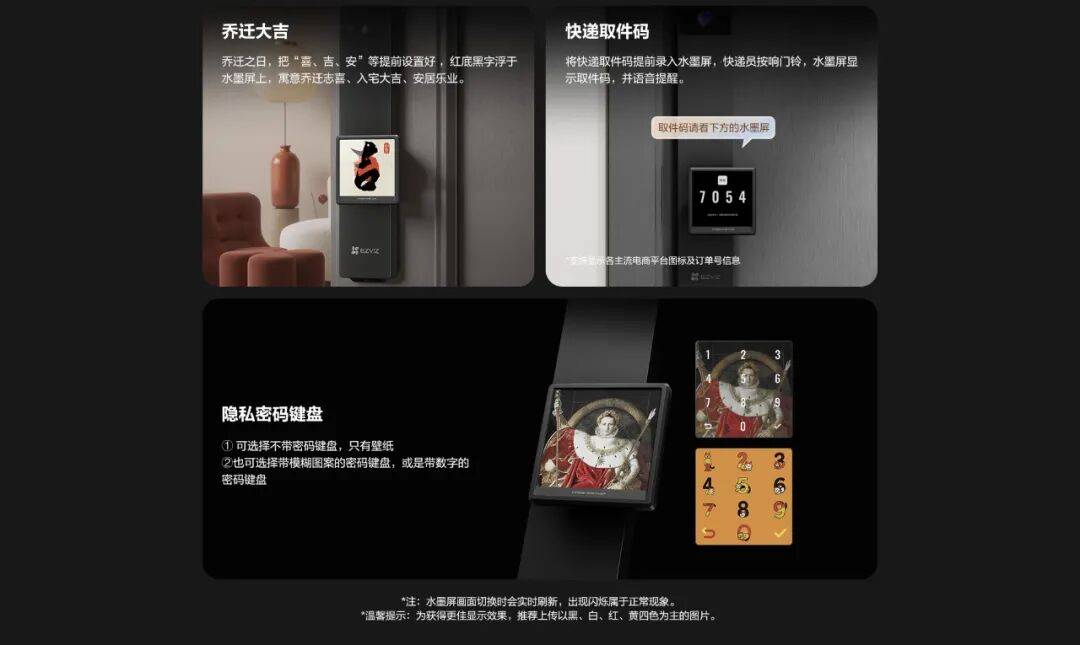 这一突破性设计不仅支持用户自定义上传家人合影、风景美图等背景画面,实现365天更换不同风格画面以打造专属入户标识,更搭载“0 耗电”技术,兼顾个性化与续航能力。针对网购退货场景,用户还可通过萤石云视频 APP设置取件码,快递员上门按响门铃时,水墨屏将自动显示该信息,让繁琐的退货流程变得便捷又高效。同时,水墨屏也可作为隐私密码键盘使用。