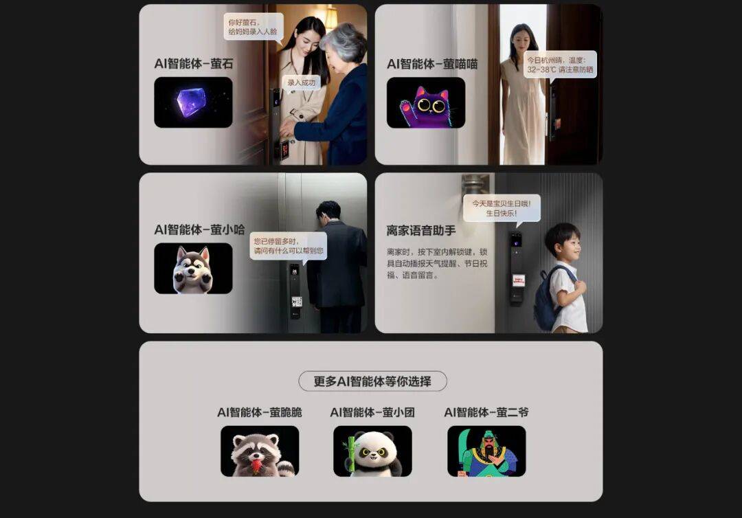 产品支持先进的AI语音指令识别,用户无需手动操作,只需说出“录入人脸信息”等指令,即可完成添加开门钥匙等操作,响应迅速快,交互体验更自然。同时,产品内置萤小哈、萤喵喵、萤脆脆、萤小团、萤石、萤二爷及专属财神等7种AI智能体形象,在交互过程中,AI智能体会在前屏上实时展示,生动的形象搭配贴合场景的语音反馈,为每一次使用注入情绪价值。