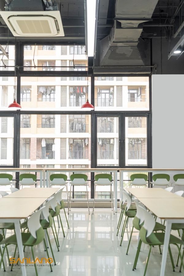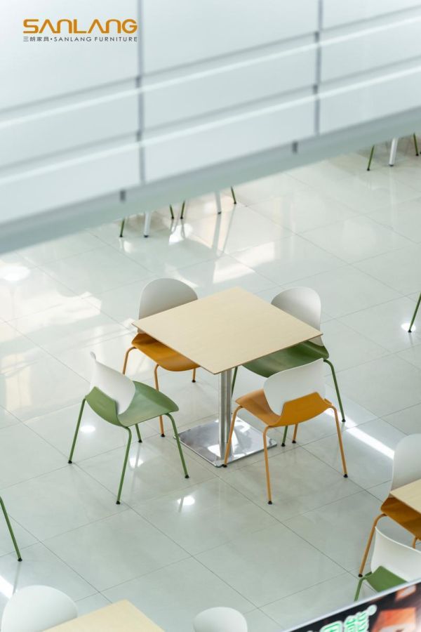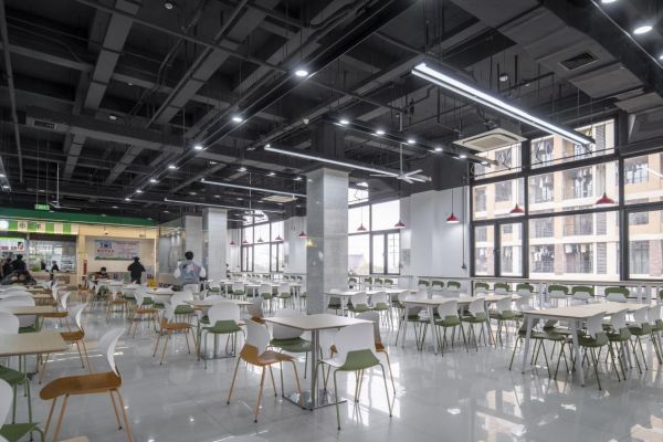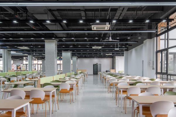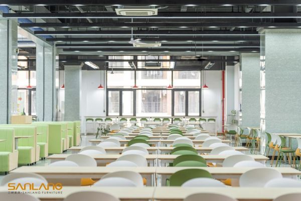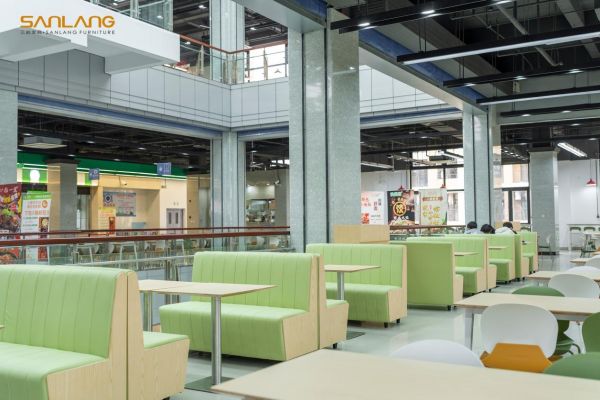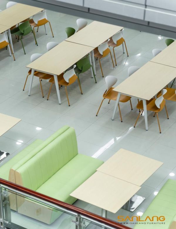 无论是标准四人桌还是舒适的卡座区,都清晰划定了通行路径与就坐区域,规整有序的排列确保了师生高峰时段也能高效通行与就座,有效避免了拥挤与混乱,形成了一种“流动的效率感”。