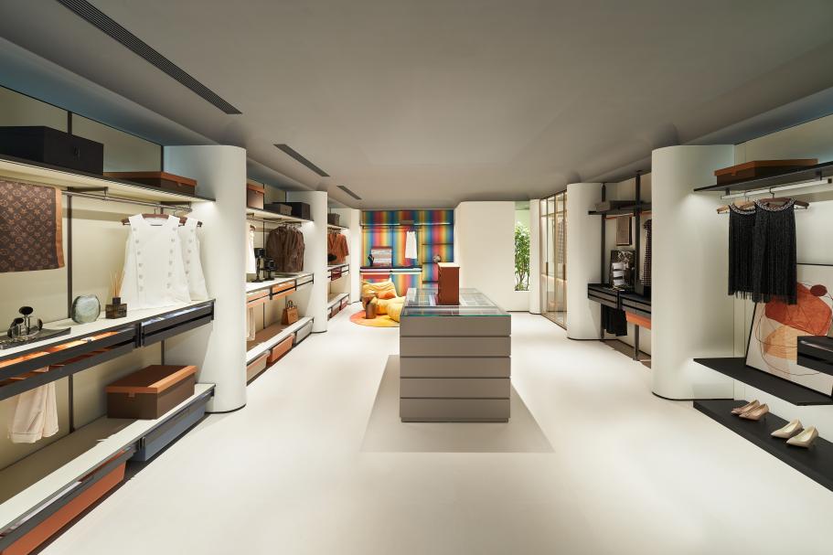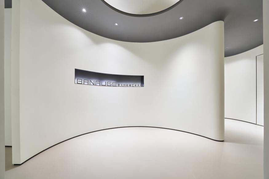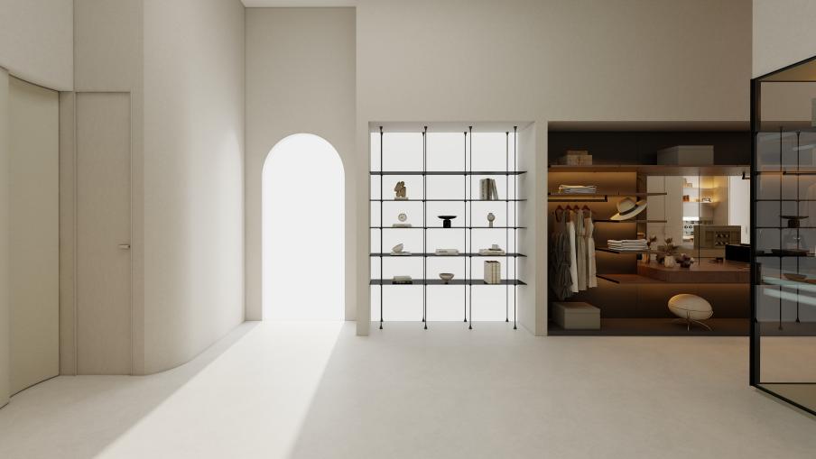 流畅的弧形门廊不仅柔化了空间轮廓,更是班鲁格对意式建筑美学的深刻理解,巧妙地营造出“引人入胜”的探索感。中央的黑色陈列架与架上艺术摆件,如同画廊中的焦点展陈,精准诠释了品牌“收纳即艺术”的核心理念——即使是功能性置物,也必须是美学呈现。
