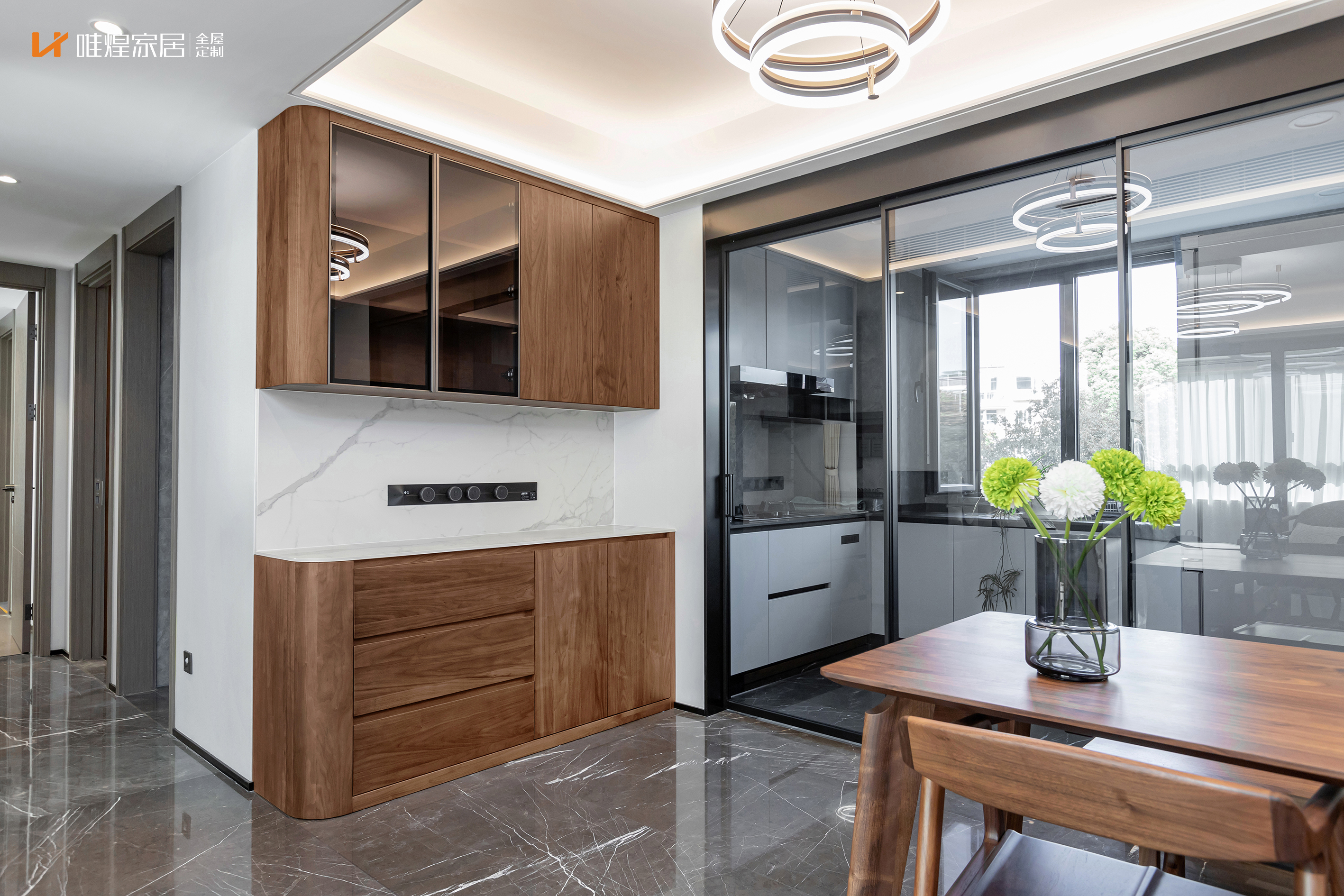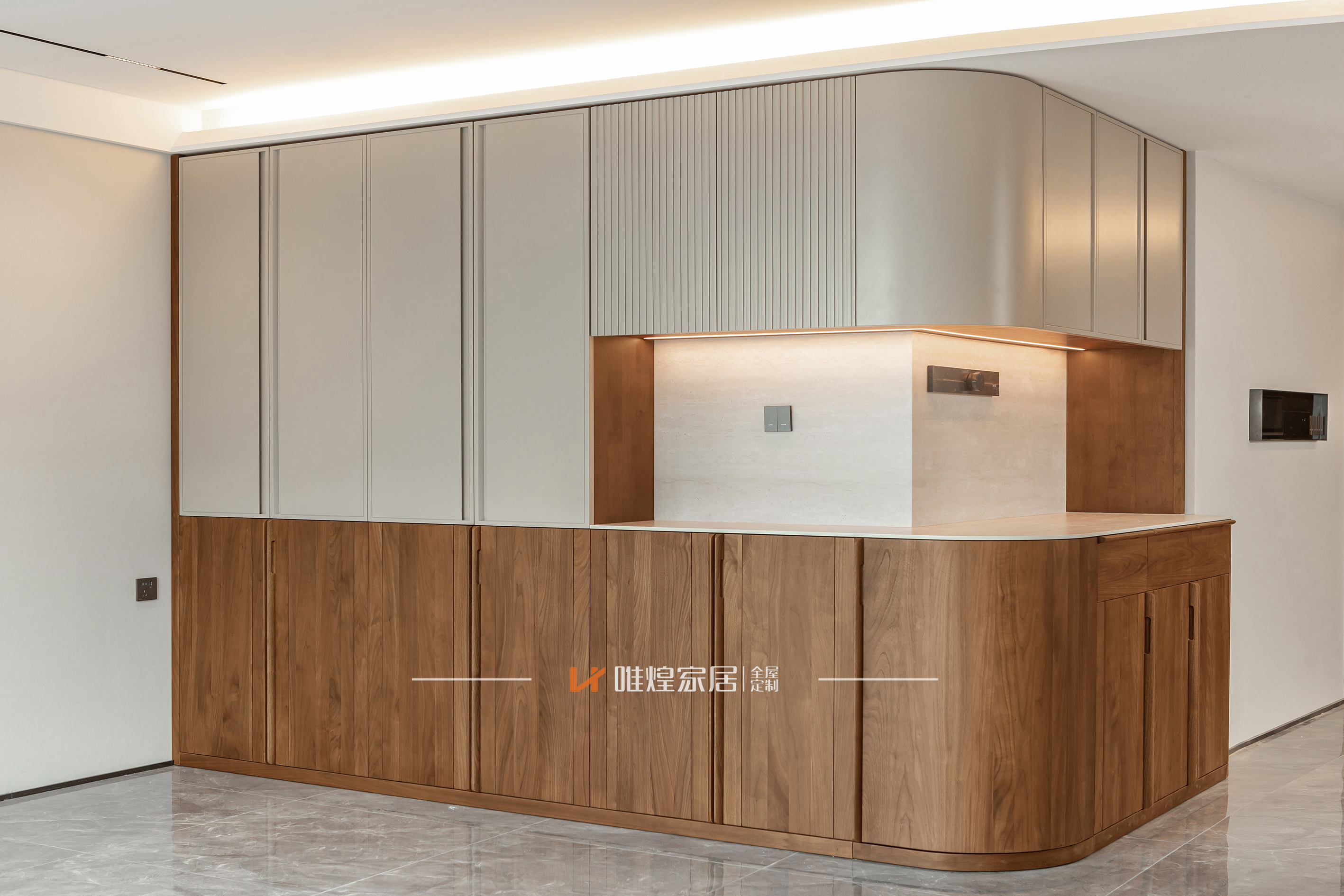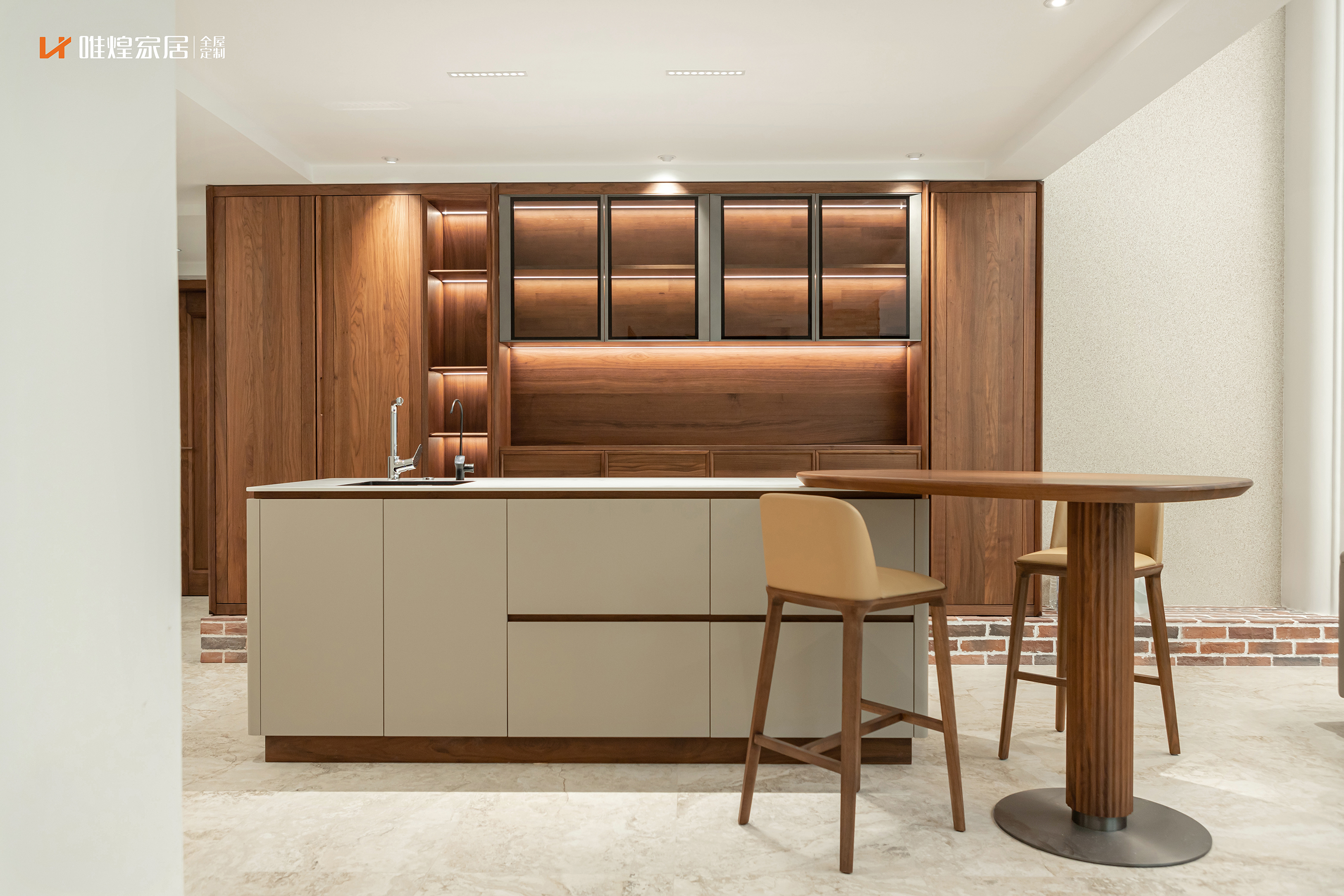 材质端协调,从通顶柜、护墙板到床、餐桌、餐椅,全部采用同一套北美黑胡桃木纹、同色系肤感漆涂装、同线条比例,实现风格协调度提升90%。在雅园别墅餐厨定制项目中,黑胡桃实木柜体与浅卡其混油门板的搭配,既保留实木温润感,又通过色彩混搭弱化厚重感,成品餐桌椅与定制岛台的材质呼应度达到100%;