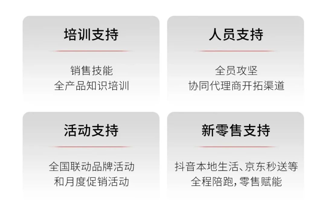 培训支持:全体系培训赋能,打造专业团队总部开设线上 + 线下双培训通道,涵盖产品知识、销售技巧、安装维护、营销推广、人员管理等全内容,提供实操培训、到店指导、远程视频培训等多种形式,从店长到店员全方位提升专业能力,让合作伙伴拥有一支能打胜仗的销售团队。活动支持:各类营销活动,助力获客引流总部统一输出品牌宣传策略,协同全国资源为区域合作伙伴提供品宣支持;全国联动品牌活动和月度促销活动,免费提供节日促销、门店活动策划方案。人员支持,助力多渠道获客全员攻坚,协同代理商开拓渠道,助力合作伙伴对接本地地产、物业、家装等渠道,实现多渠道获客,提升门店销量。新零售支持:拓展线上渠道协助拓展线上渠道,包括抖音本地生活、京东秒送、淘宝闪购、美团闪购等,运营指导,全程陪跑,赋能新零售。