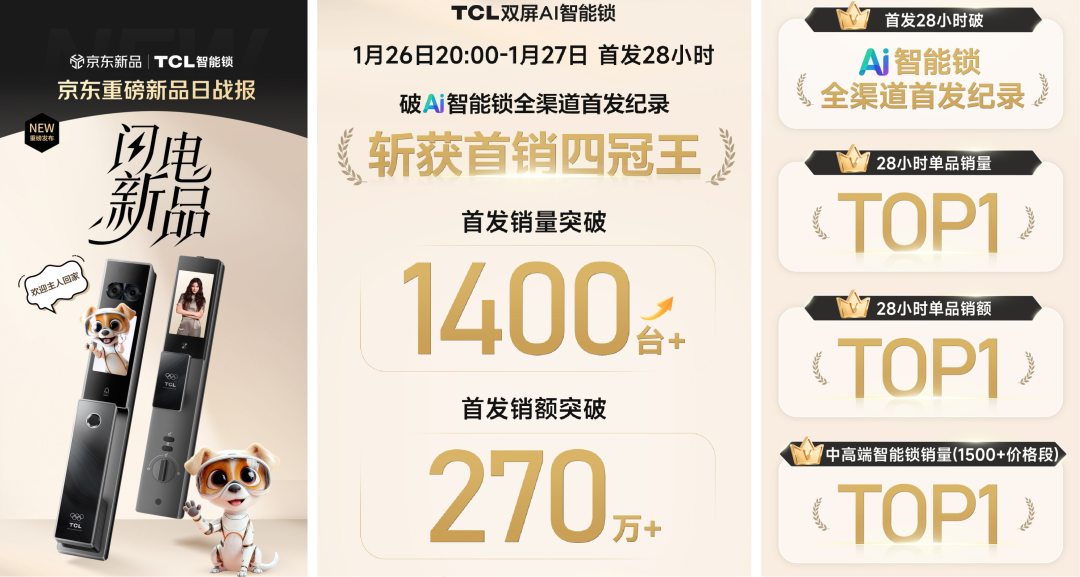 多年来,TCL在智能锁AI技术研发上持续投入,推出多款AI智能锁,并广受消费者好评。以近期首销的TCL双屏AI智能锁K11D Pro为例,上市28小时内即售出1400台+,强势突破AI智能锁全渠道首发纪录,斩获京东智能门锁行业首发销额、销量双料纪录第一,成为名副其实的“四冠王”。该产品在AWE2026上荣获“艾普兰创新奖”,其搭载的4英寸超大触控外屏与4.5英寸智能内屏,依托伏羲AI大模型,让用户通过语音即可完成操作,将冰冷的硬件转变为贴心的“智能助理”。