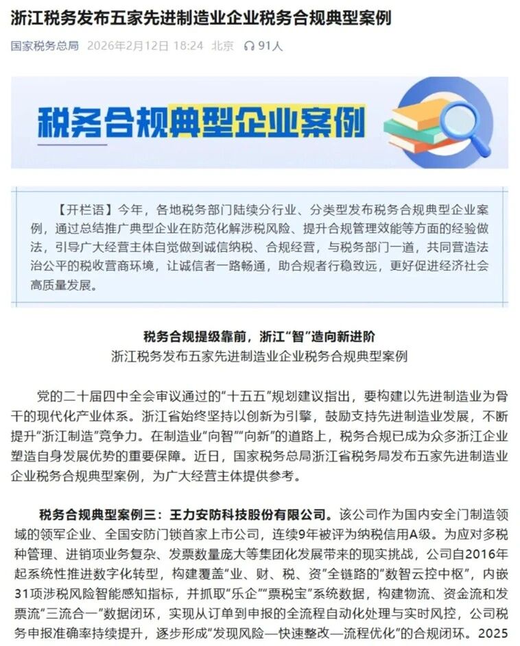 近日,国家税务总局浙江省税务局发布五家先进制造业企业税务合规典型案例,王力安防作为国内安全门制造领域的领军企业、全国安防门锁首家上市公司,成功入选。这是继2023年成为金华地区唯一与浙江省税务局签订《税收遵从合作协议》(签约期内税收免检)的企业后,王力安防在短短两年内获得的又一权威认可。