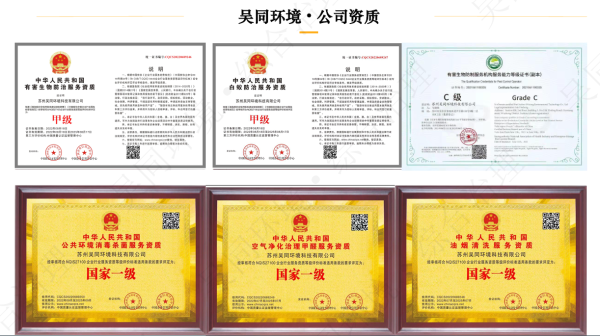 资质实力:公司拥有有害生物防治甲级资质、白蚁防治甲级资质、公共环境消毒杀菌国家一级资质、空气净化治理甲醛国家一级资质、油烟清洗国家一级资质,企业信用等级达到AAA级。