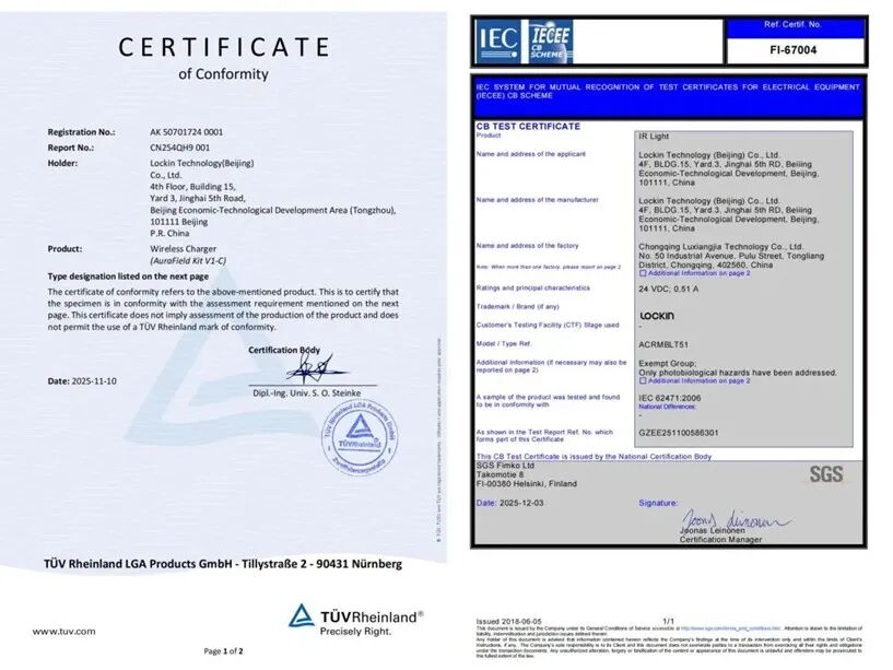 当前,智能门锁行业常见的前三代供电方案(如干电池/锂电池、单晶硅太阳能、钙钛矿太阳能)等,普遍存在续航短、充电频繁、受光照环境制约等一系列局限。鹿客全球独家首发的Lockin AuraCharge奥充™技术,目前已实现4米长距离范围无限供电,并已通过国际知名机构德国TÜV莱茵与SGS的双重光生物安全认证,发射器可稳定持久运行10年以上,引领智能锁行业供电技术摆脱光束缚,实现从“有限续航”向“无限续航”的第四代代际跨越。