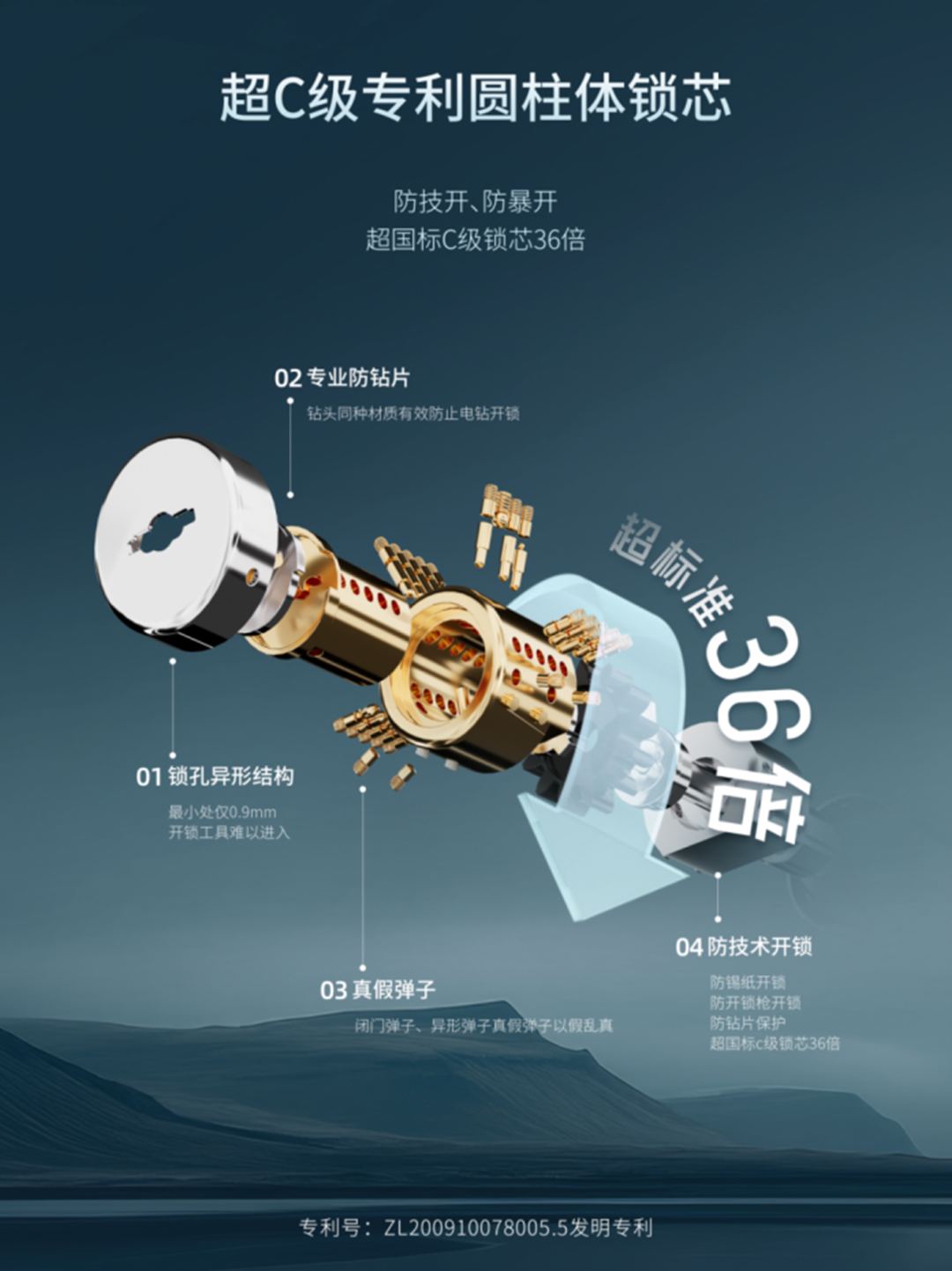 面对这些防盗难题,王力安防自主研发的超C级圆柱体锁芯,从结构设计到材质选用实现全维度升级:外部采用不锈钢360°包裹强化,质地坚硬耐磨损,普通工具无法轻易破坏;内部集成闭门弹子、异形弹子、真假弹子等多重防护机制,一旦感知异常拨动,即刻触发二次锁死功能,从根源上杜绝技术开锁可能;核心区域植入特制防钻片与防钻销,即便遭遇电钻、开锁枪等暴力开启手段,也能牢牢守住家门防线,让远方的牵挂落地为实实在在的安全感。